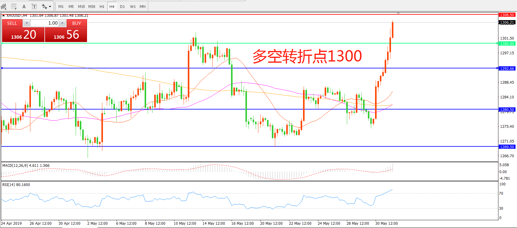 交易策略:在1300.00之上看涨,目标1308.00   1320.00