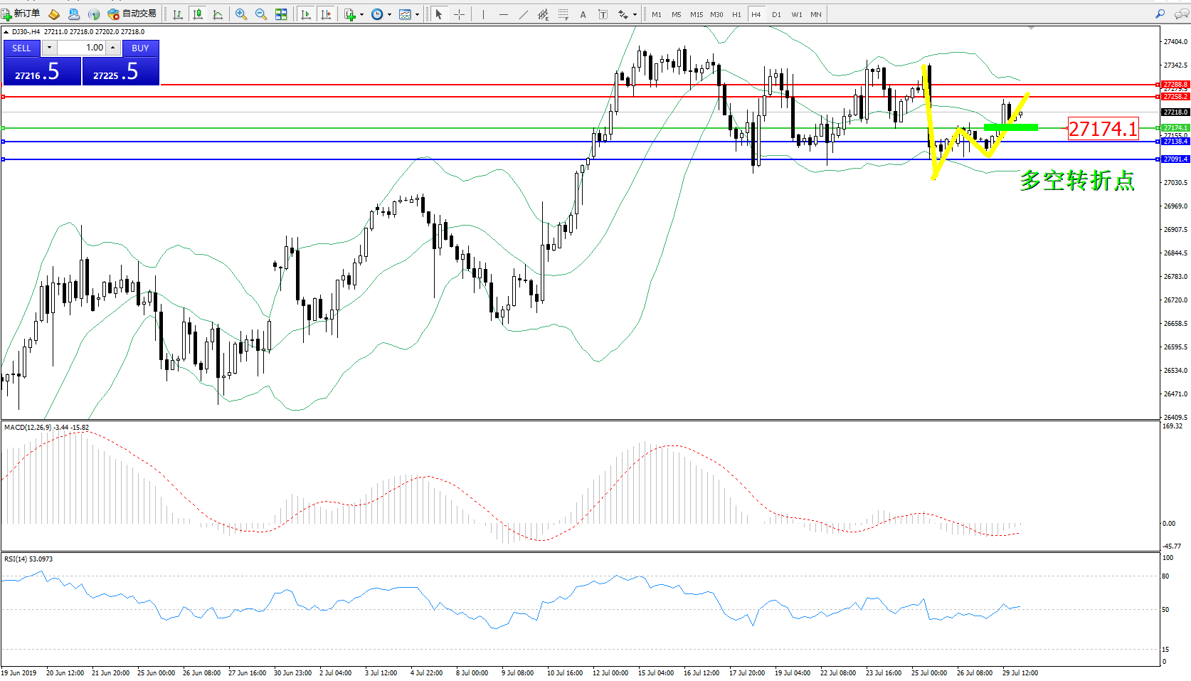 道琼斯指数DJ30—— 4小时K线图显示: