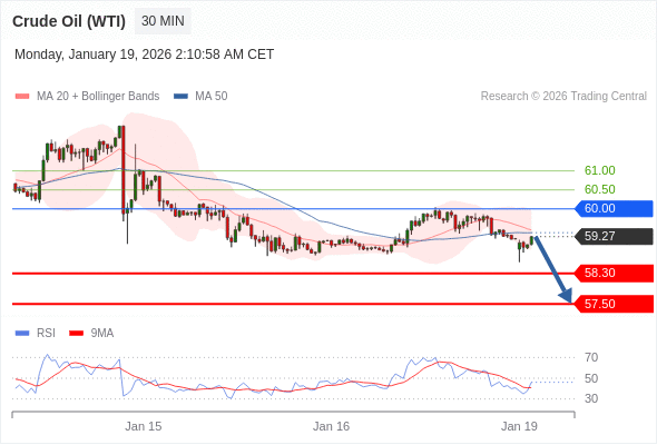 交易策略: 在 60.00 之下,看跌,目标价位为 58.30 ,然后为 57.50 。
