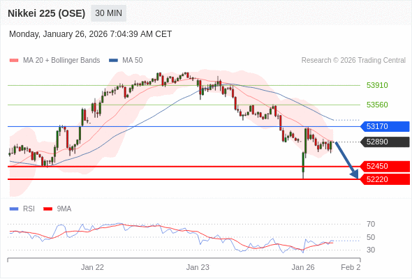 在 53170 之下,看跌,目标价位为 52450 ,然后为 52220 。
