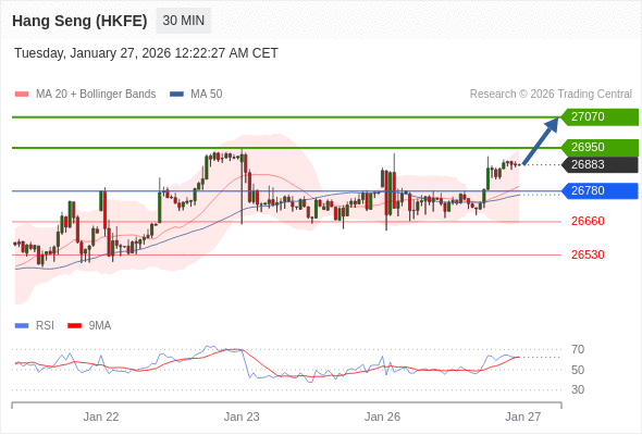 在 26780 之上,看涨,目标价位为 26950 ,然后为 27070 。