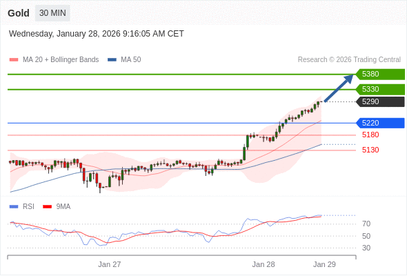 交易策略: 在 5220 之上,看涨,目标价位为 5330 ,然后为 5380 。