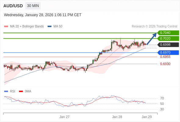 在 0.6970 之上,看涨,目标价位为 0.7020 ,然后为 0.7040 。
