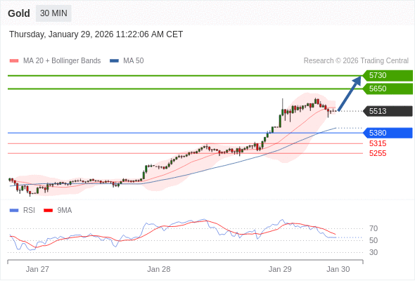 在 5380 之上,看涨,目标价位为 5650 ,然后为 5730 。