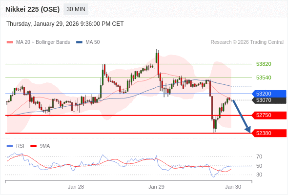 在 53200 之下,看跌,目标价位为 52750 ,然后为 52380 。