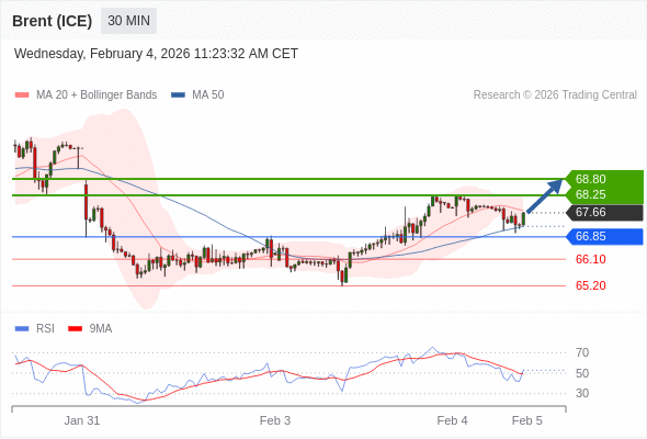 在 66.85 之上,看涨,目标价位为 68.25 ,然后为 68.80 。