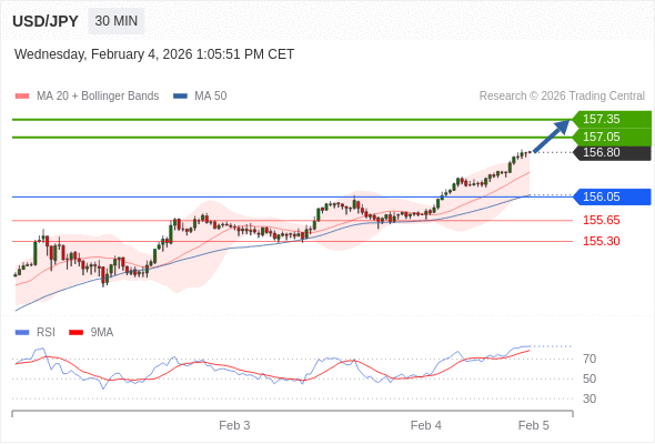 在 156.05 之上,看涨,目标价位为 157.05 ,然后为 157.35 。