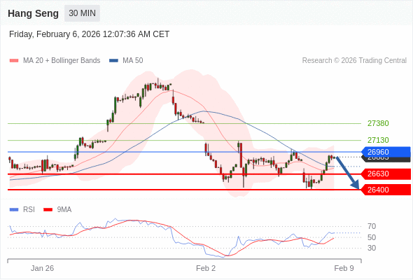 恒生指数 当日内: 短期关键阻力位在26960。