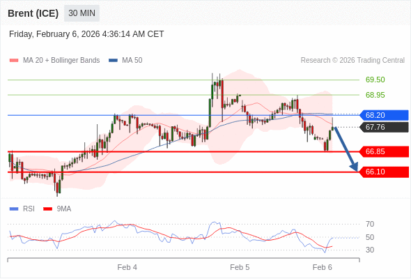 在 68.20 之下,看跌,目标价位为 66.85 ,然后为 66.10 。