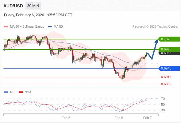在 0.6940 之上,看涨,目标价位为 0.6995 ,然后为 0.7025 。