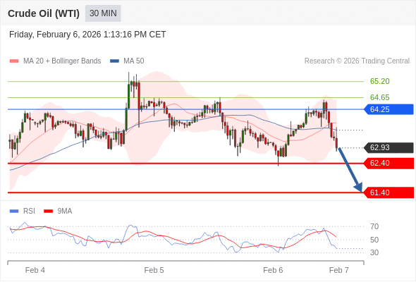 在 64.25 之下,看跌,目标价位为 62.40 ,然后为 61.40 。