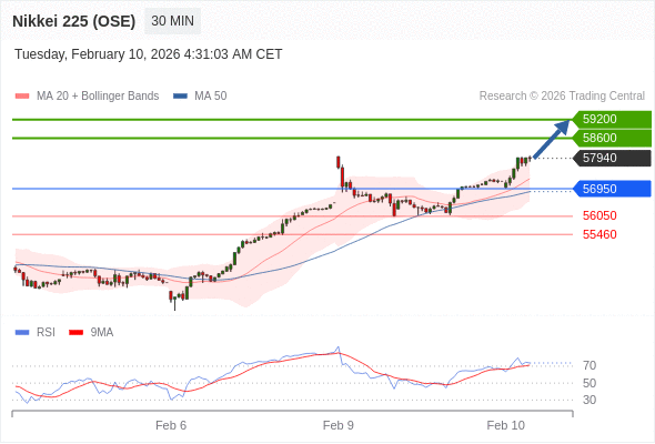 在 56950 之上,看涨,目标价位为 58600 ,然后为 59200 。