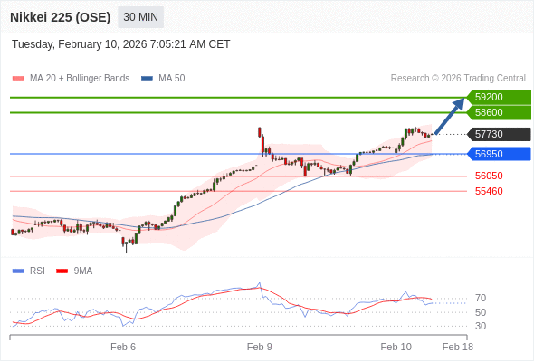 在 56950 之上,看涨,目标价位为 58600 ,然后为 59200 。