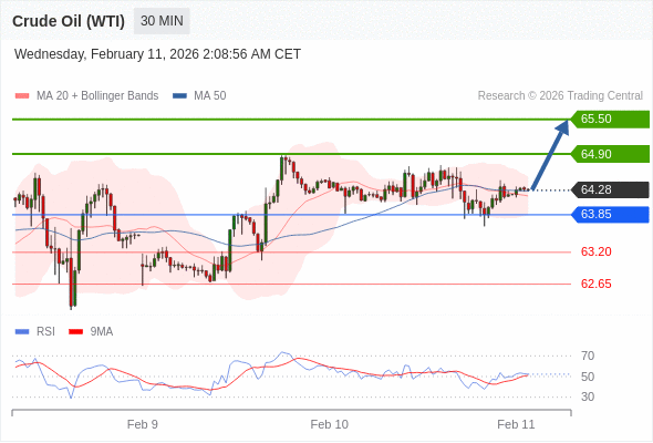 在 63.85 之上,看涨,目标价位为 64.90 ,然后为 65.50 。