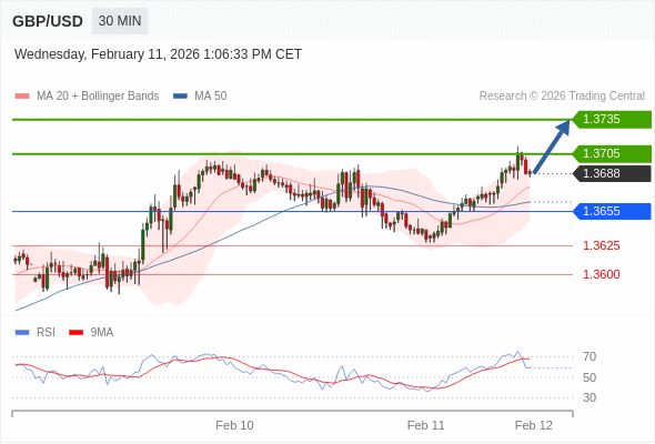 在 1.3655 之上,看涨,目标价位为 1.3705 ,然后为 1.3735 。