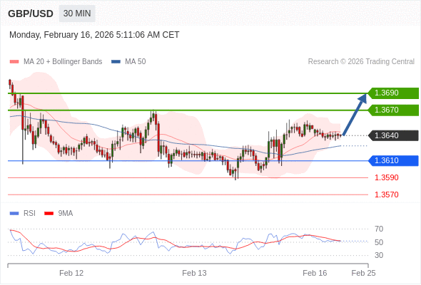 在 1.3610 之上,看涨,目标价位为 1.3670 ,然后为 1.3690 。