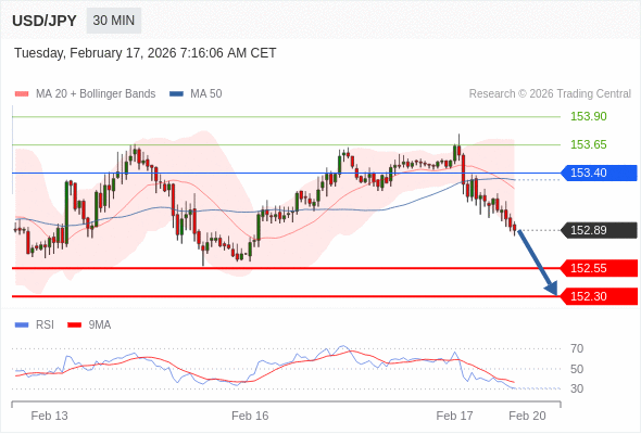 在 153.40 之下,看跌,目标价位为 152.55 ,然后为 152.30 。