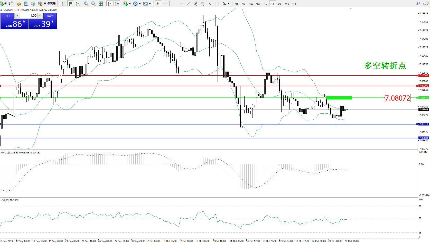 美元人民币USDCNH——4小时K线图显示: