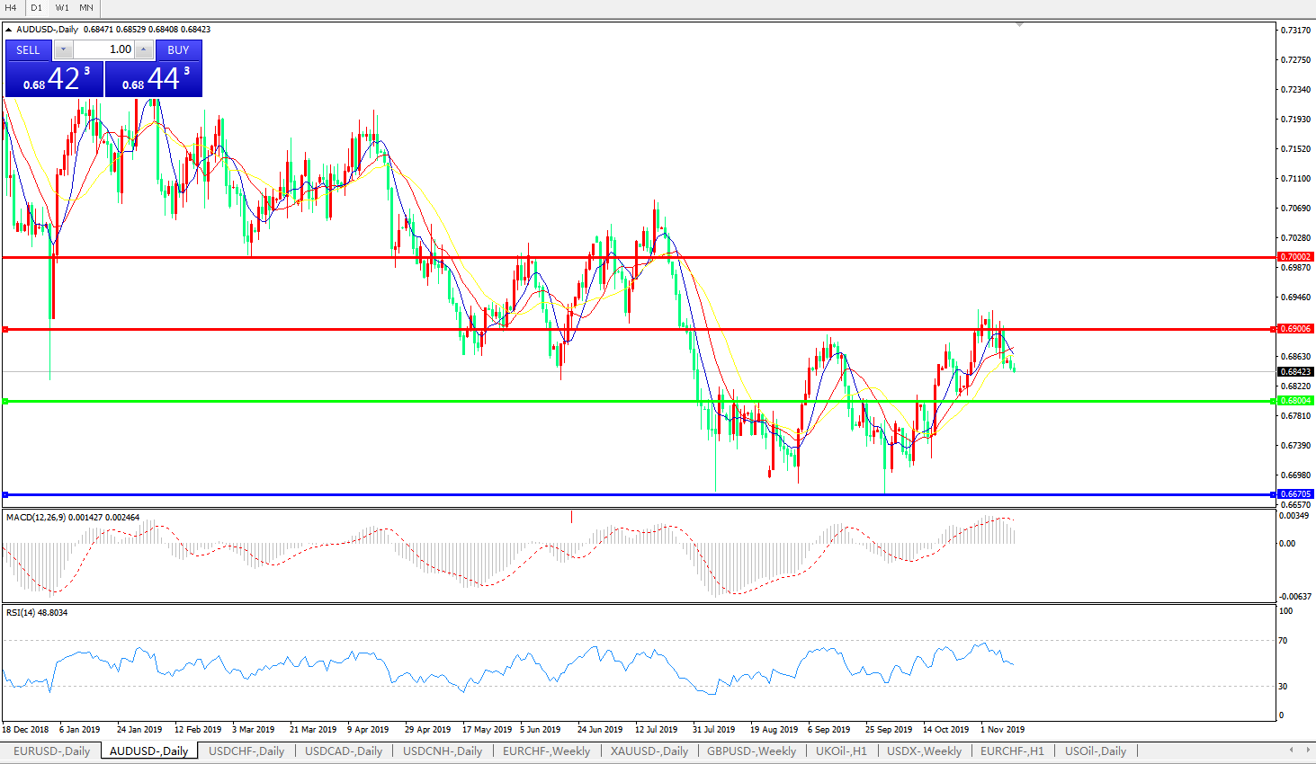 澳元兑美元在周一亚洲时段始终陷于低位盘整,创下自10月29日以来近两周新低0.6848,因此前带动商品系货币走强的贸易利好消息影响进一步退潮,投资者转而对经济领域的需求状况再生顾虑,这令澳元汇价首当其冲;虽然澳洲联储上周二的政策决议措辞曾助推澳元创出新高,但之后在周五公布的会议纪要却又透露了近乎截然相反的措辞,这令行情出现见顶回落。而投资者更担心的则是澳洲本国及其贸易伙伴的经济基本面。周末澳洲最大贸易伙伴中国发布的PP数据仍深陷负区间,显示对工业原材料产品需求受限,这对于澳元走势是最直接的冲击; 这也意味着澳元仍然陷于筑底过程中,未能完成破位上行的最终进程程,上方200日均线压力依然强大,日内低点处的100日均线成为短线争夺目标。在国际贸易新协议最终白纸黑字落定之前,市场谨慎情绪仍将阻止澳元汇价过快上行。
