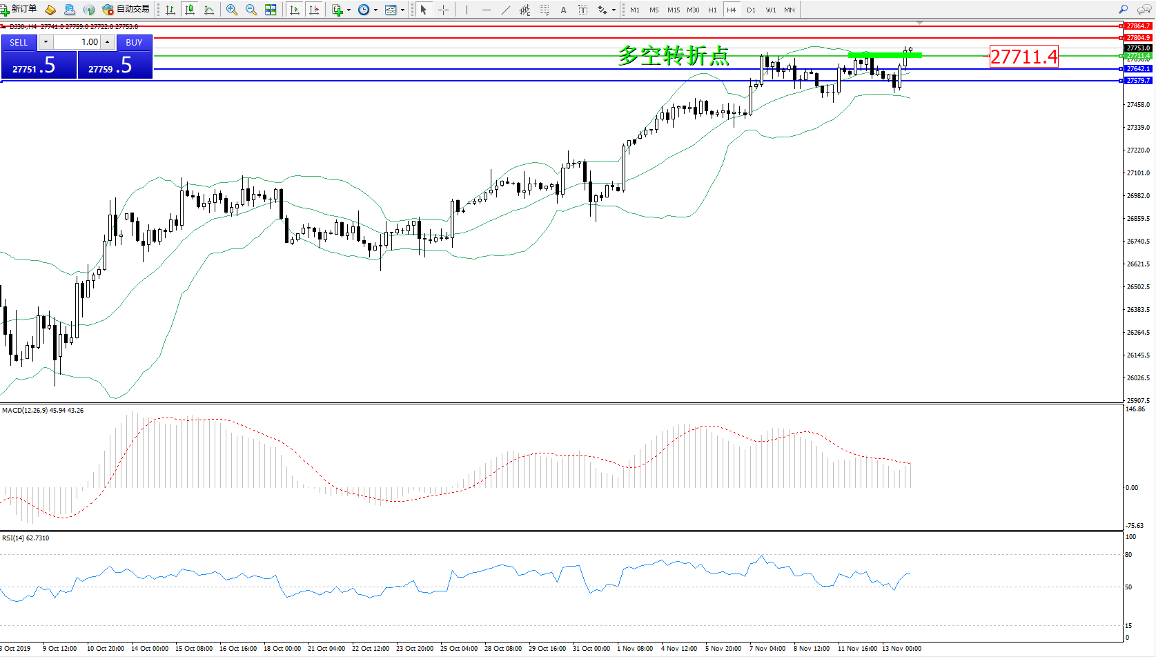 道琼斯指数DJ30—— 4小时K线图显示: