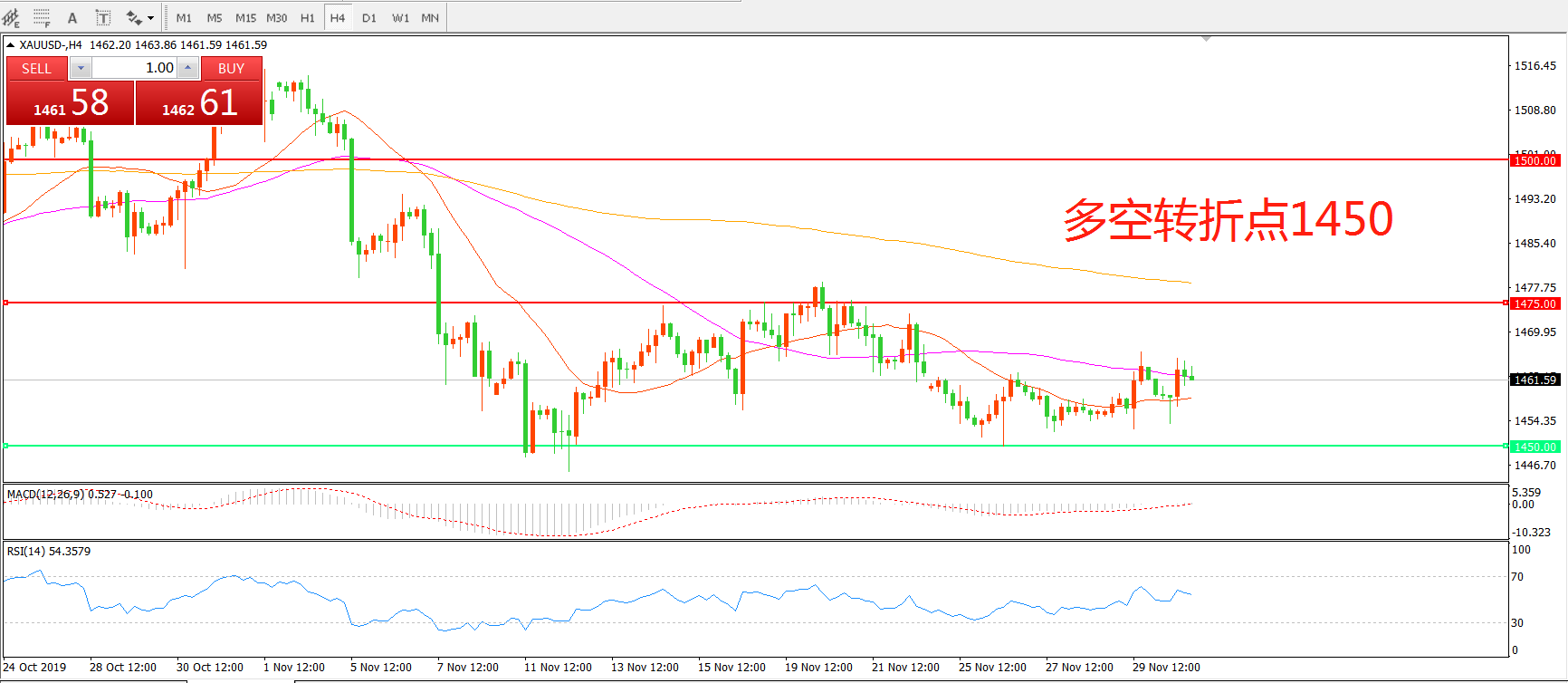 周一(12月2日),美国最新公布的ISM制造业PMI指数再次下滑,且连续第四个月维持在荣枯线下方。与此同时,美国10月营建支出也意外下滑,释放出对经济的又一警告信号。美元和美股遭到抛售,现货黄金趁势拉升,最终收报1461.58美元/盎司。本周美国方面数据较多,尤其是周五的非农就业人口数据,务必重点关注。