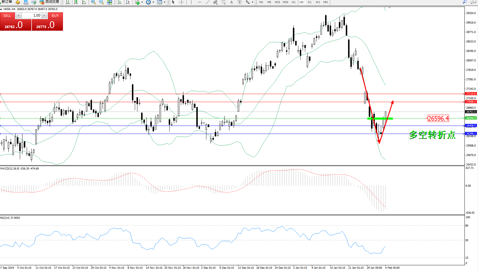 恒指HK50 ——4小时K线图显示: