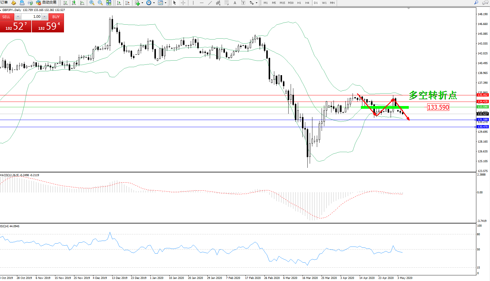 交易策略:133.590下方看跌,目标131.588130.470