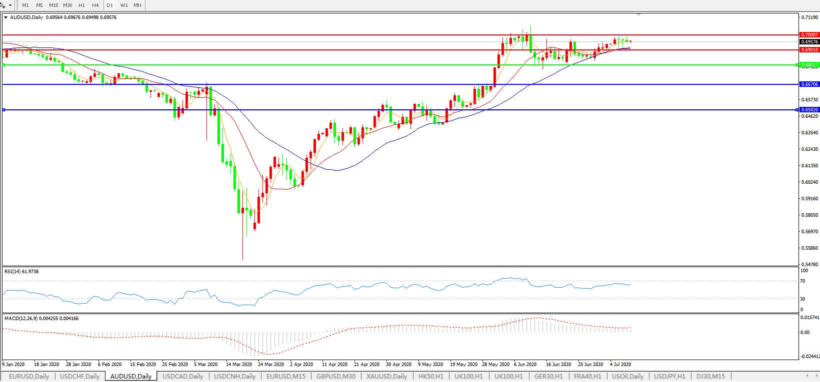 技术面简析:日图均线维持发散上行态势,汇价小幅回落整理,MACD运行于0轴上方但量能持续缩量,RSI缓步走弱,预计汇价短线大概率将继续整理,关注0.7000 关口压制。