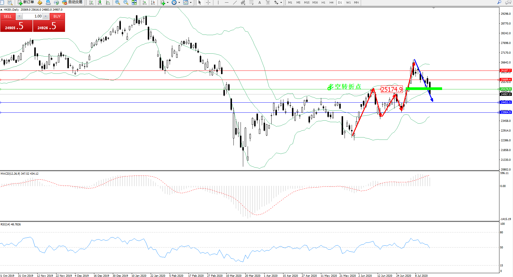 香港恒生指数716日(周四)收盘下跌510.89点,跌幅2.00%,报24970.69点;港A股市今日集体走弱,,三大指数全日呈下跌之势。恒指跌2%24970点失守25000点关口,市场恐慌情绪再起,行业板块近乎全部下挫,半导体股暴跌,中芯国际大跌超25%;大型科网股集体下跌,腾讯大跌5.5%,阿里巴巴跌超4%,京东跌超2%。今日南下资金逆势净流入21.79亿港元,大市成交额为1997亿港元。香港特区政府统计处今日公布,5月香港商品整体出口货量及进口货量分别按年下跌6.7%及11%。总计今年首五个月,香港的商品整体出口货量及进口货量亦分别按年下跌7.3%及9%。
