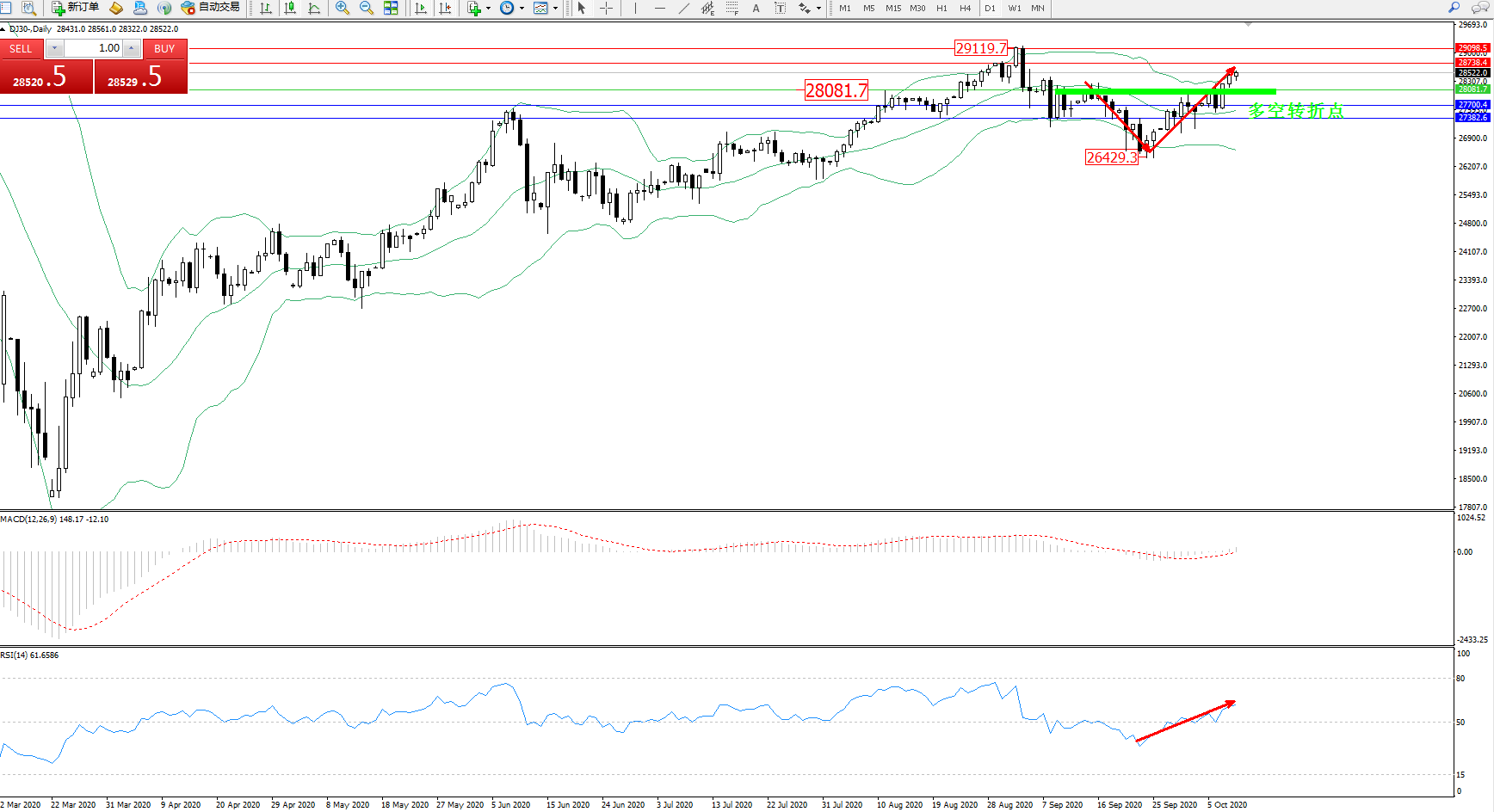技术点评:空头动力延续布林带指标中下轨区间弱势下行至26429位置后得到支撑开始呈V型反转上移,触及布林带指标上轨附近后遇阻开始窄幅震荡中,但多头动力仍处于上扬拉升态势,有继续破上轨迹象,布林带指标呈收口平移走势后有张口迹象,短期或将有试探突破上轨位置节点迹象,MACD指标处于0轴线上方弱势徘徊中,RSI指标纠结于50均衡线上方持续整理后缓慢上扬;