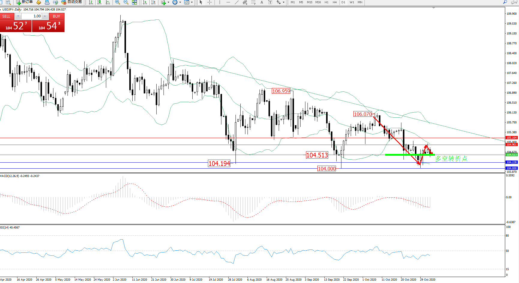 备选策略:104.513下方看跌,目标104.228、104.000