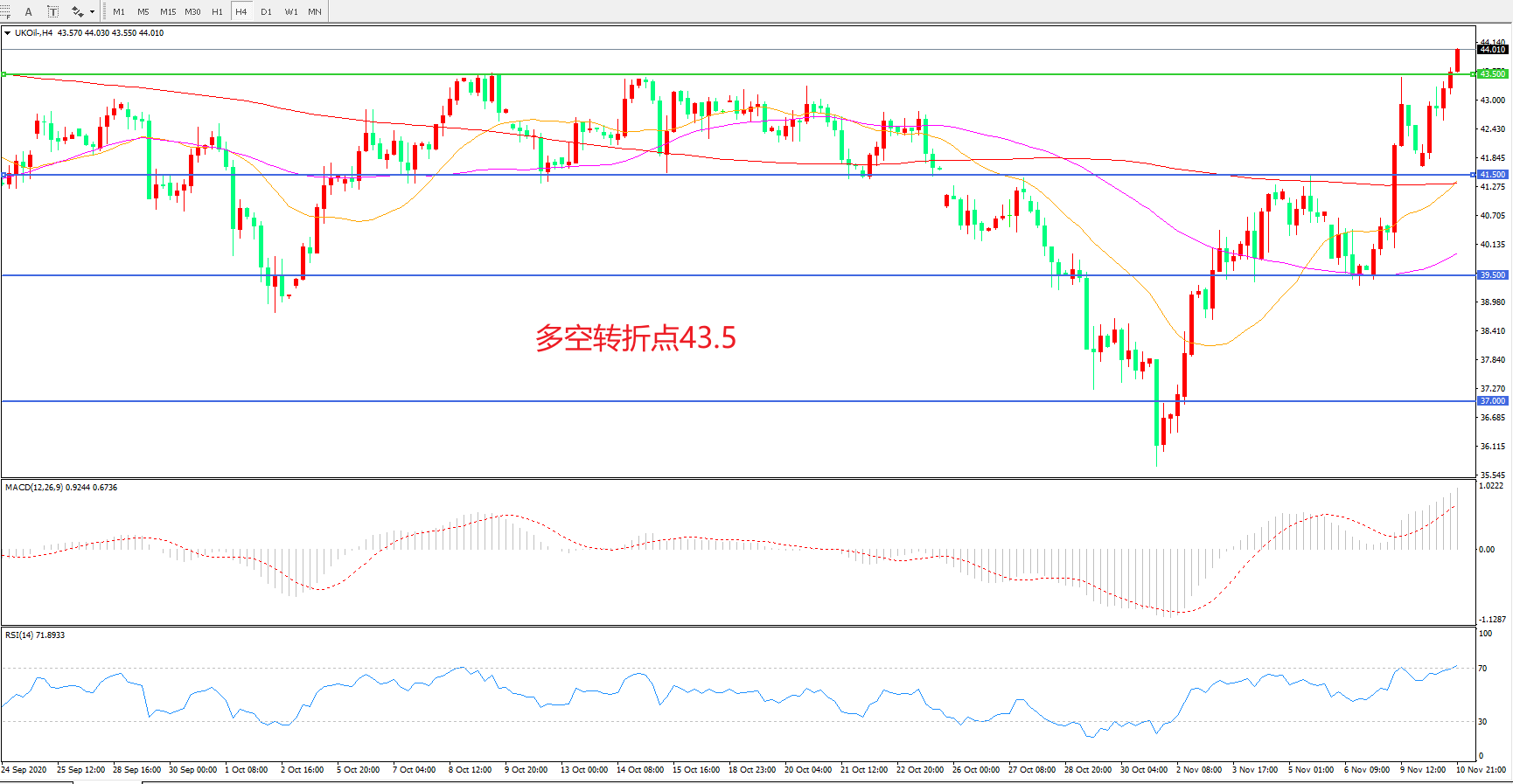 4小时图看,油价阳线连续拉升,短期表现偏强,43.5是前期整理区间上沿,如能突破站有望开启新一轮的涨势,MACD红柱增加,RSI指标走平,日内延续上行概率较大。