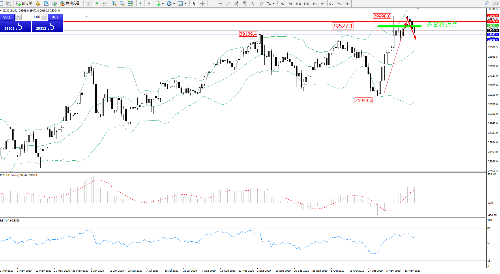技术点评:低位多头动力强势拉升上扬至29998附近后遇阻开始震荡,高位出现短暂回撤走势,布林带指标呈张口走势后开始有收口迹象,MADC指标处于多头区域持续震荡上移后开始持续走平,RSI指标处于多头区域维持整理平移后有回撤下移迹象;