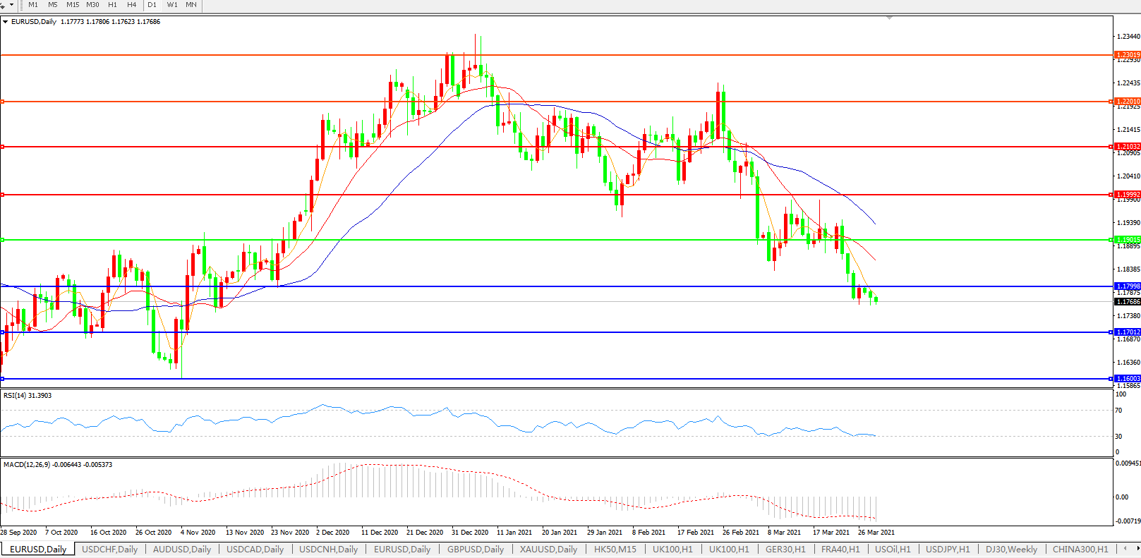 技术面简析:日图短均线呈发散下行态势,汇价持续弱势下行,MACD运行于0轴下方但量能0轴下微放量,RSI震荡走弱,预计短期汇价大概率将进一步走低。