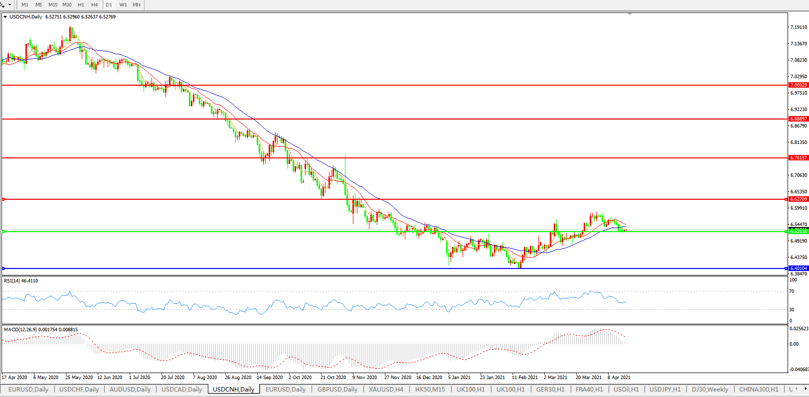 美元兑人民币USDCNH 日线图: