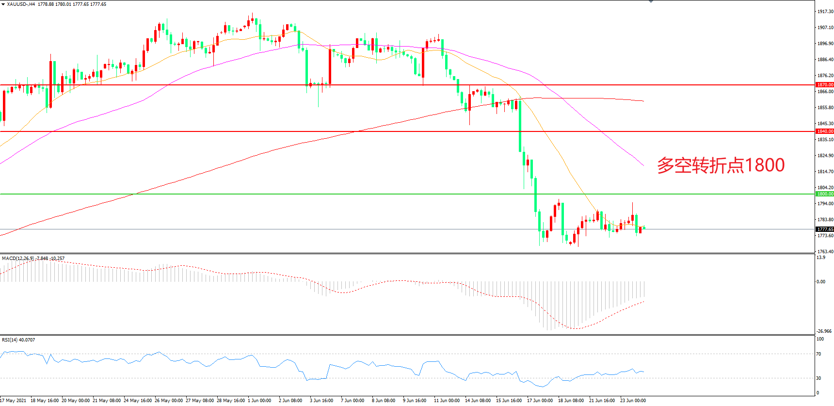4小时图看,金价延续低位震荡,短线跌势有所缓解,但空头趋势依然明显,1800成为短期阻力,MACD绿柱缩短,RSI指标走平,日内震荡下行概率较大。