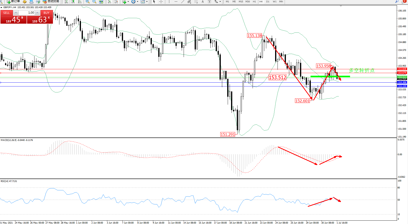 备选策略:153.512上方看涨,目标153.679、153.828