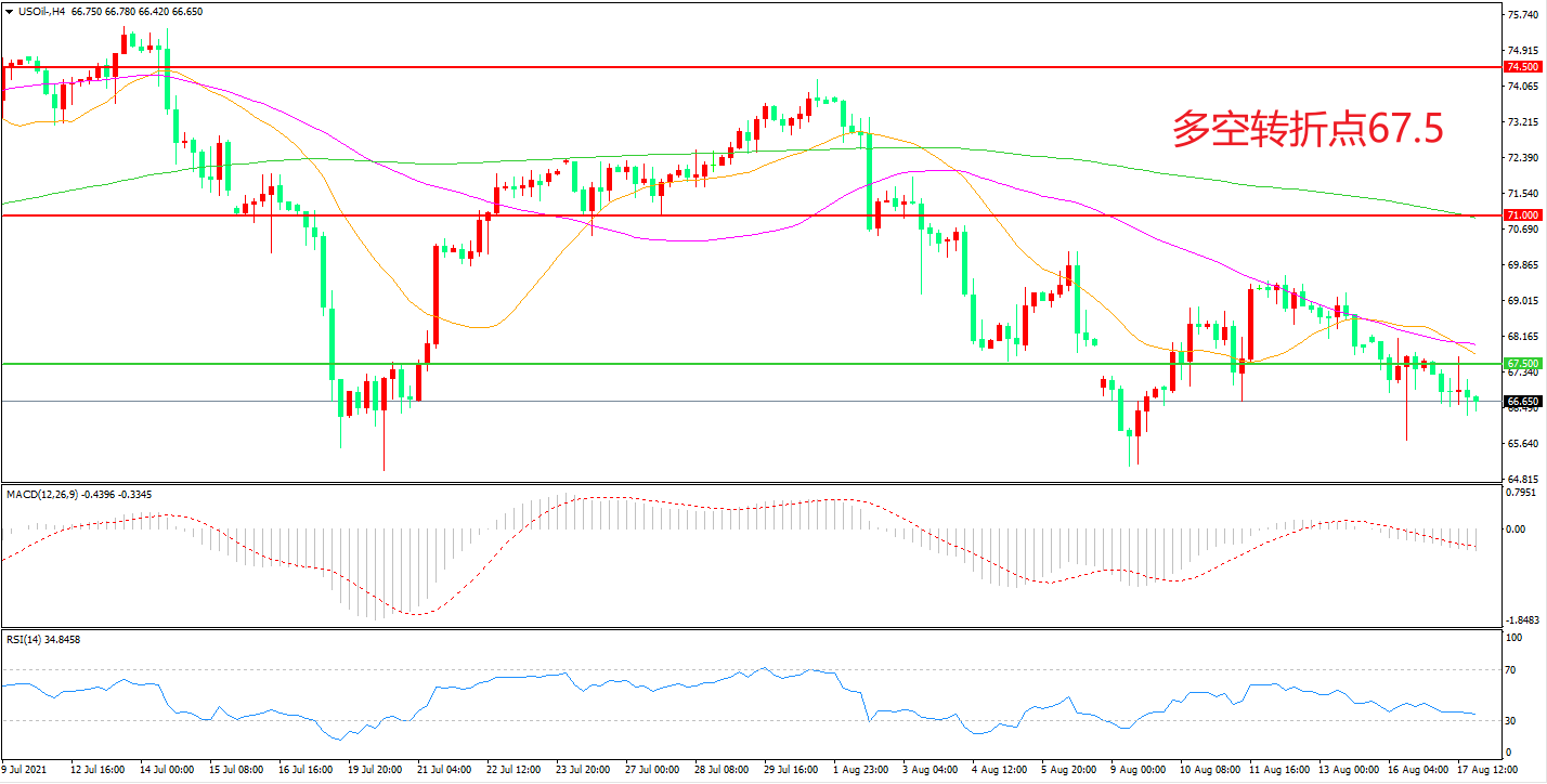 周二(8月17日),新冠病毒的新型变种在世界范围内激增加剧了人们对市场燃料需求的担忧,美国WTI原油延续低位震荡,收报66.64美元/桶。随着上方压力逐渐增大,短期多空博弈有所加剧。周三(8月18日)凌晨,根据美国石油协会公布数据显示,当周API原油库存表现差强人意,如果晚间EIA表现不能提振市场,油价可能会迎来新一轮的下行。