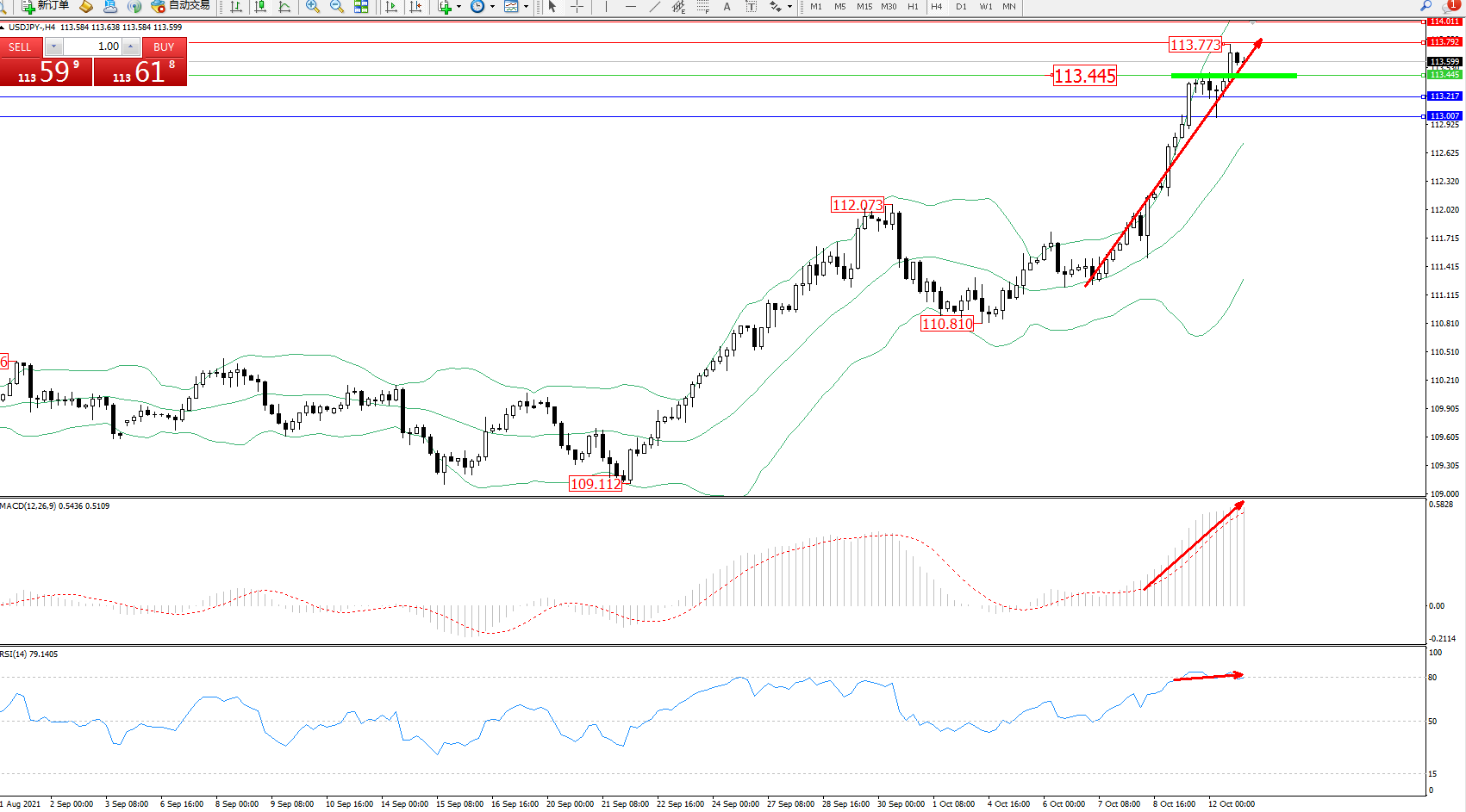 技术点评:多头动力延续布林带指标上轨附近持续震荡上扬,高位抵达113.773位置后开始短暂整理,多头动力有进一步向上移动态势,布林带指标呈收口走势持续向上移动中,MACD指标处于多头区域维持高位整理,RSI指标处于80均衡线附近弱势徘徊中;