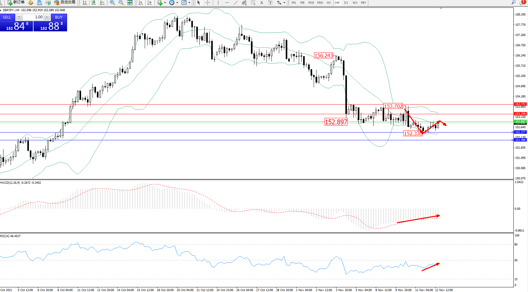 备选策略:152.897上方看涨,目标153.299、153.772