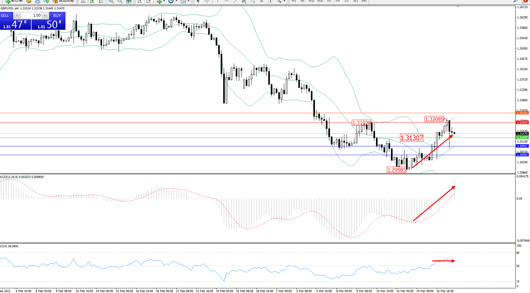 技术点评:多头动力延续布林带指标通道中上轨区间持续震荡上扬,高位抵达1.32085位置节点后震荡,短期多头拉升开始有所减弱,布林带指标呈张口走势后开始有收口迹象,MACD指标处于多头区域维持震荡上移后开始平移,RSI指标处于50均衡线上側维持弱势徘徊中;