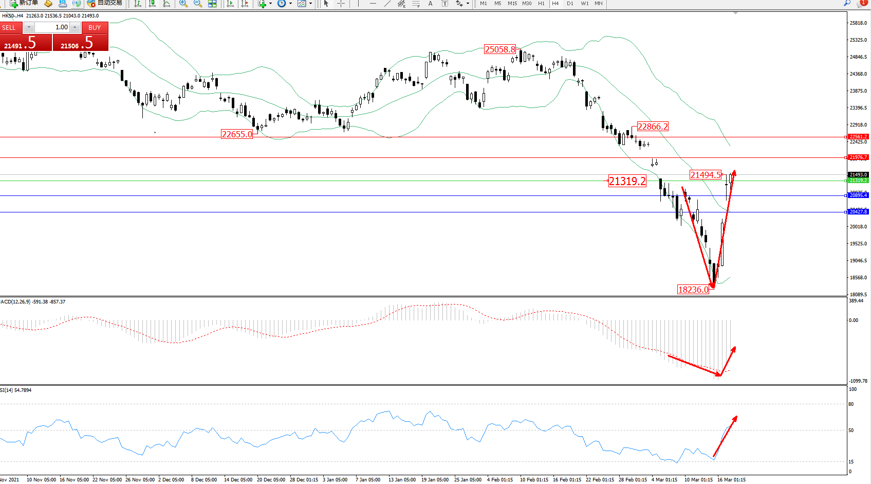 恒指HK50 ——4小时K线图显示: