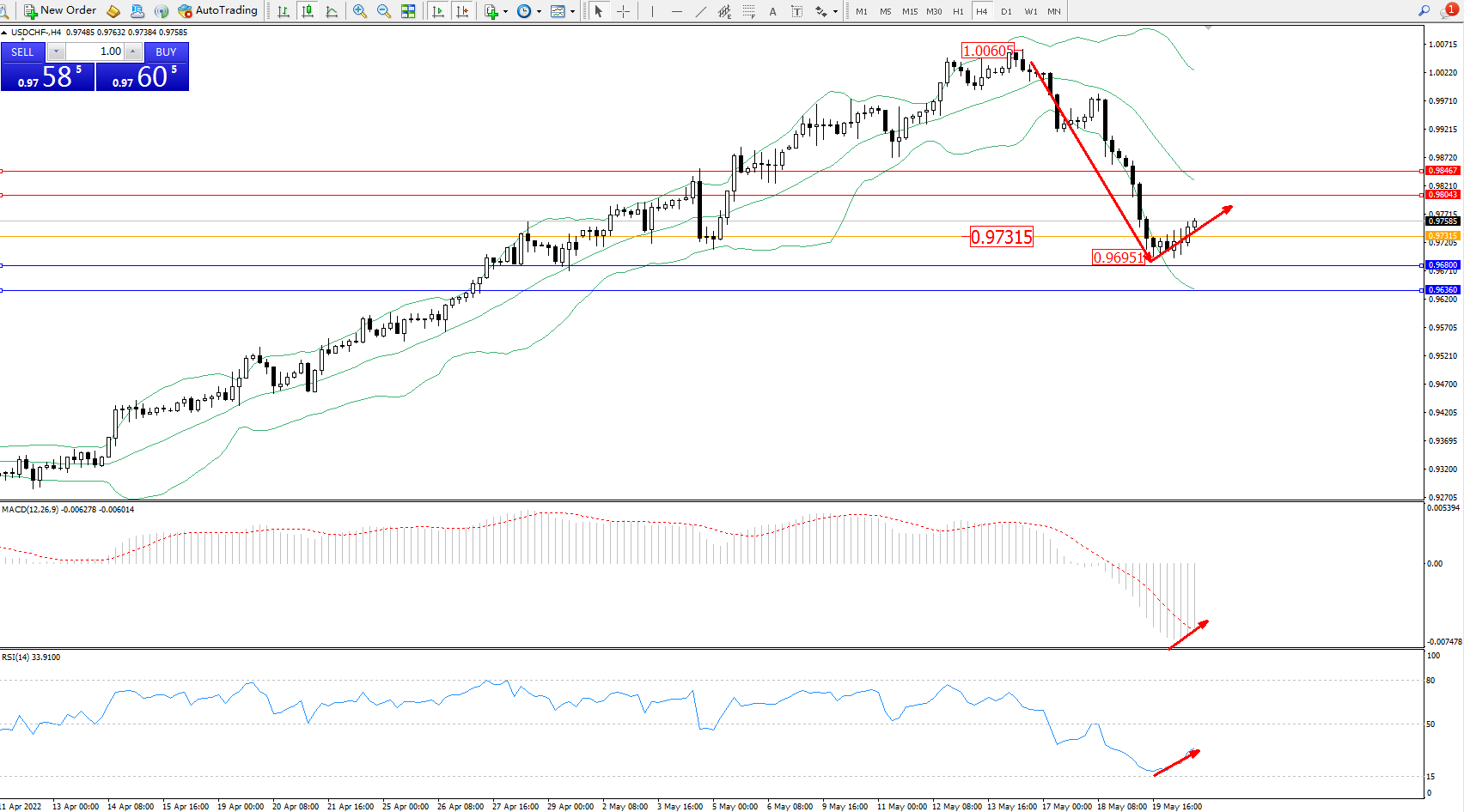 备选策略:0.97315下方看跌,目标0.96800、0.96360
