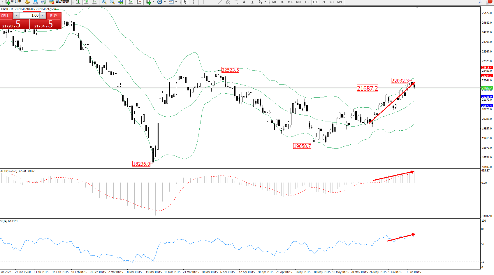 交易策略:21687上方看涨,目标22244、22616