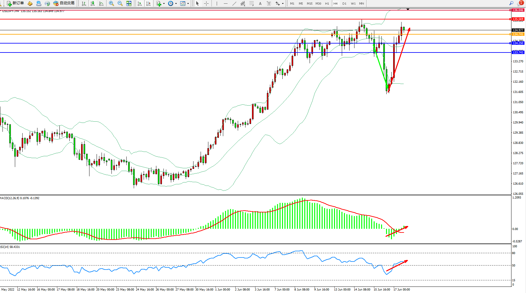 交易策略:134.745上方看涨,目标135.569、136.046