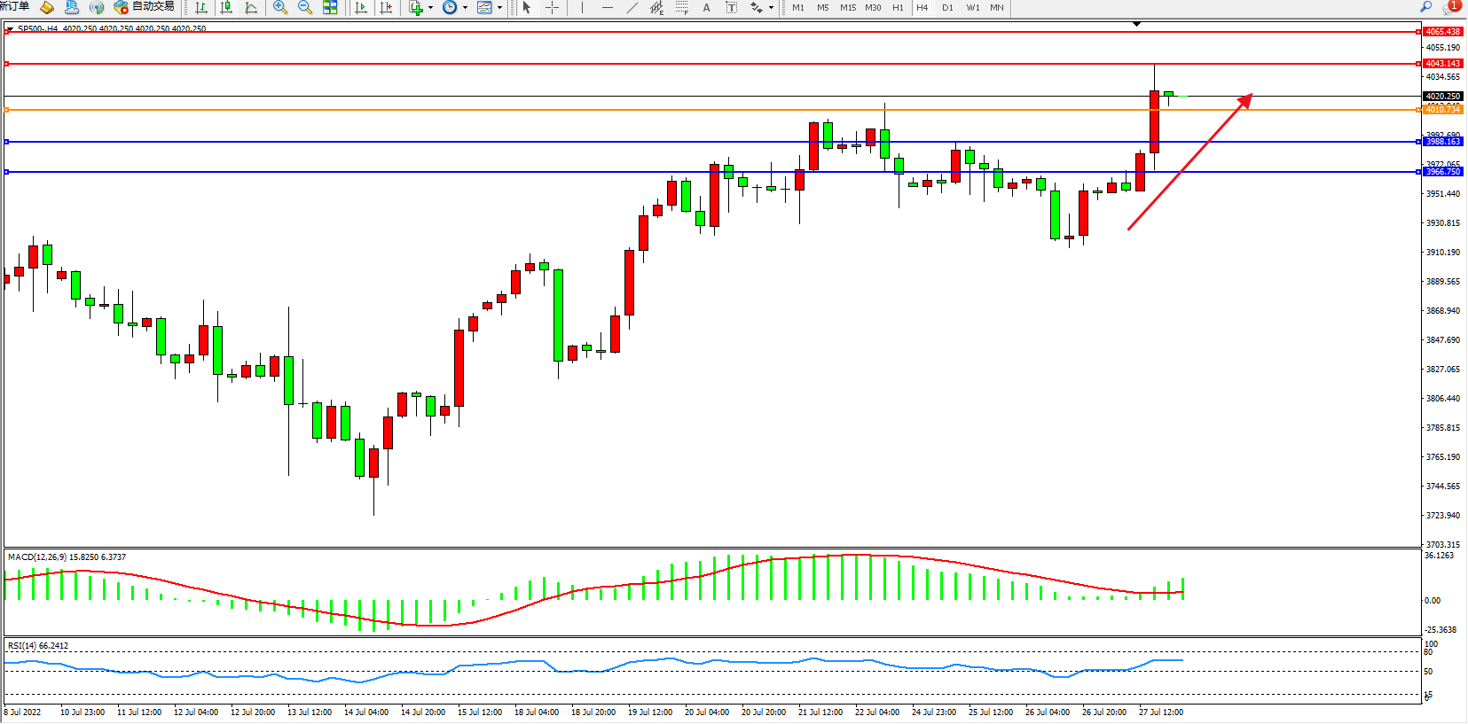 标普SP500——4小时K线图显示: