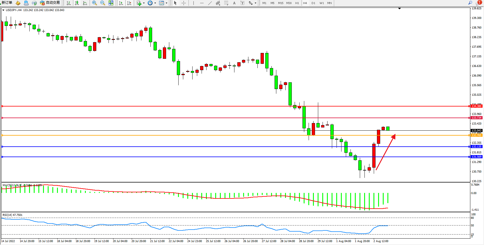 交易策略:132.765上方看涨,目标133.734、134.380