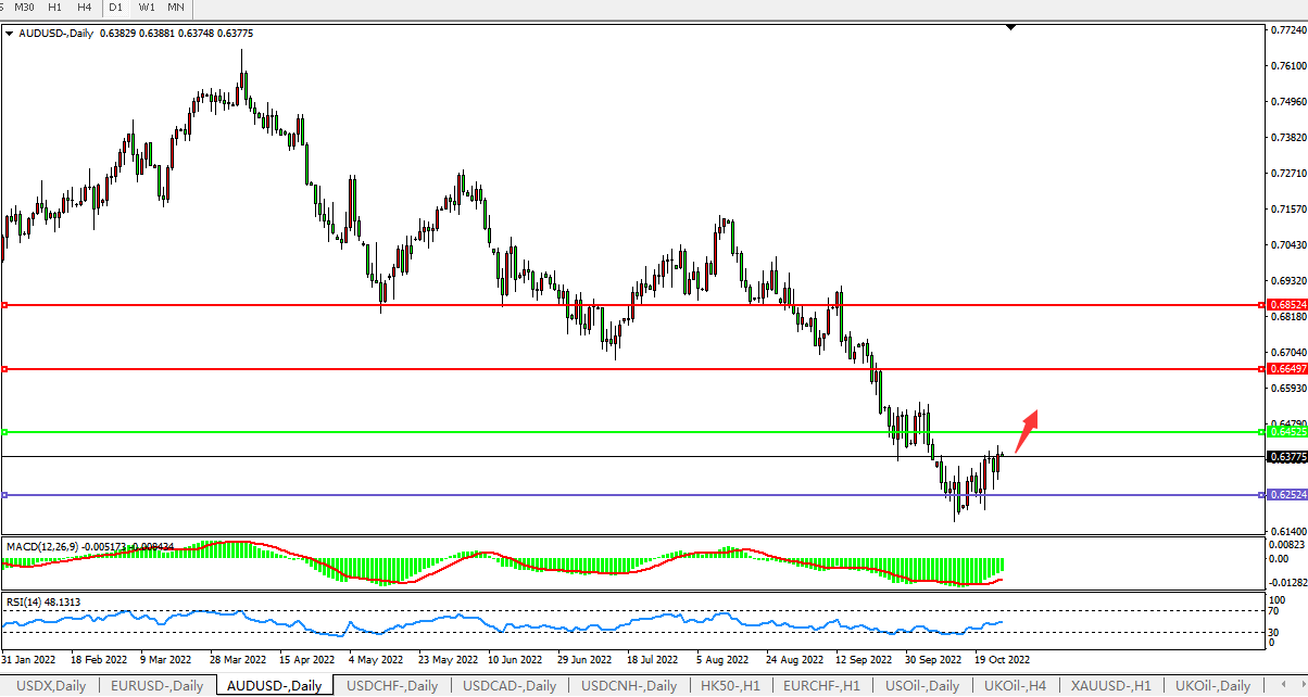 日线图看:短期汇继续小幅走高,MACD运行于0轴下方但量能持续缩量,RSI持续走强,预计汇价大概率短期将进一步反弹上攻。