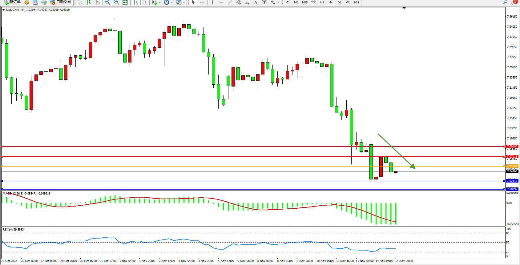 交易策略:7.05161下方看跌,目标7.02113、7.00397