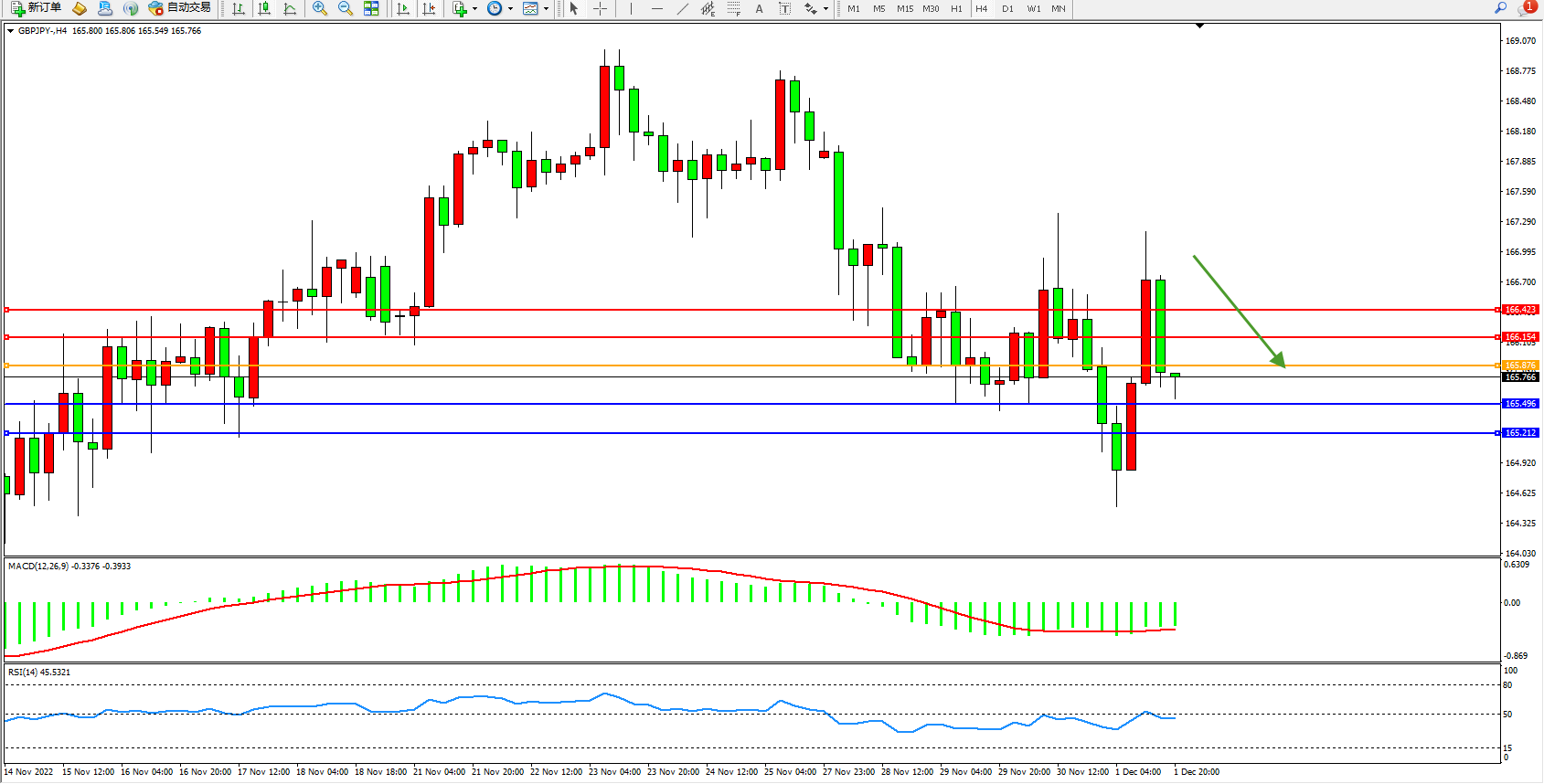 交易策略:165.876下方看跌,目标165.496、165.212